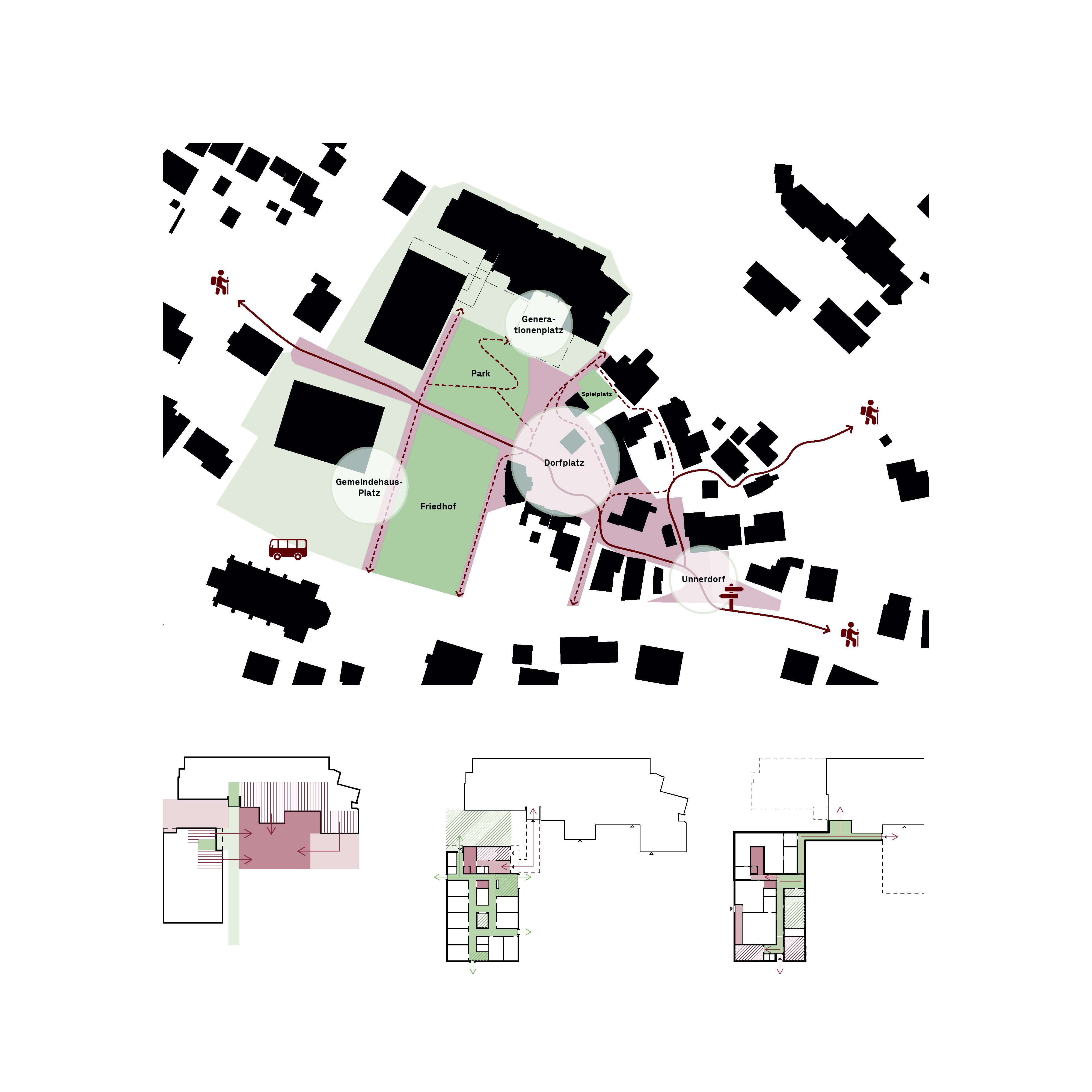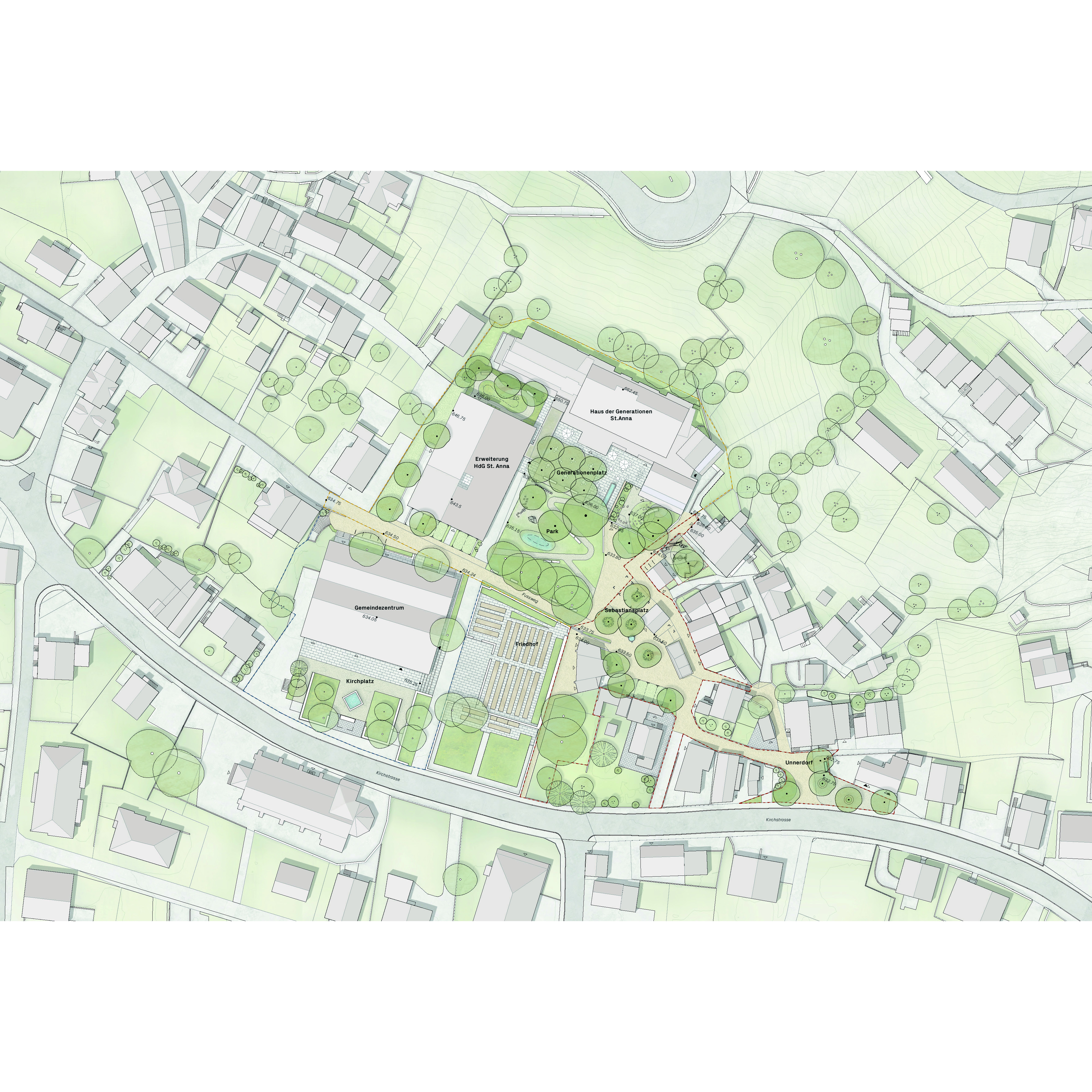 Die Neugestaltung und Aufwertung der verschiedenen Perimeter bietet die Möglichkeit, bislang getrennte Bereiche miteinander in Beziehung zu setzen und als einheitliches Ganzes zu formen. Ein durchgängig barrierefreier Natursteinbelag fasst die verschiedenen Räume zusammen und schafft so eine Verbindung der gemeinsam genutzten Freiräume. Der zentral gelegene Park sowie der Kirchplatz dienen als Begegnungs- und Erholungsräume, fördern den sozialen Austausch und ermöglichen altersübergreifende Aktivitäten. Naturnahe Gestaltungselemente wie Sitzbereiche, Spiel- und Bewegungszonen sowie eine Wasserfläche mit Retentionsfunktion verbinden Aufenthaltsqualität mit ökologischer Wirkung.