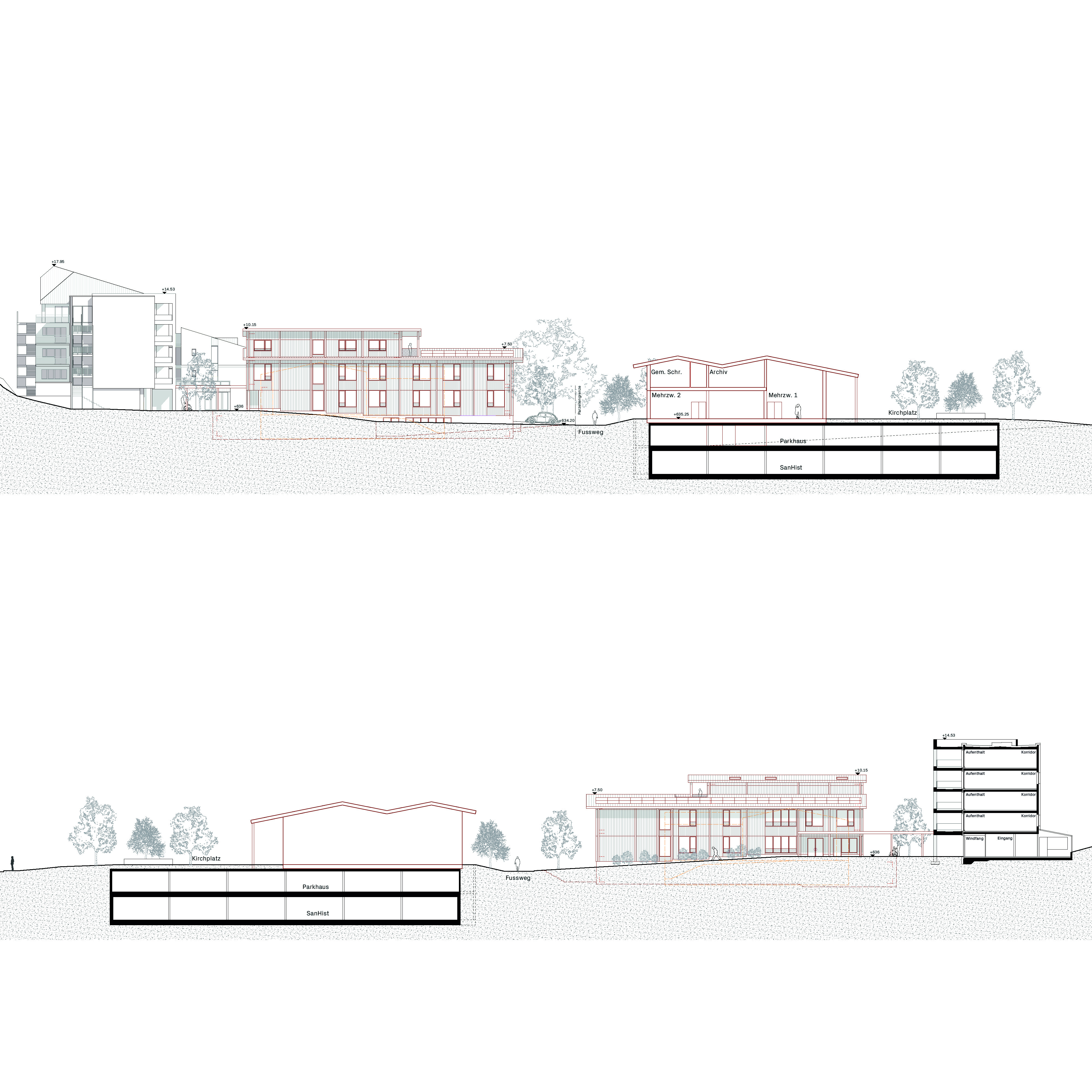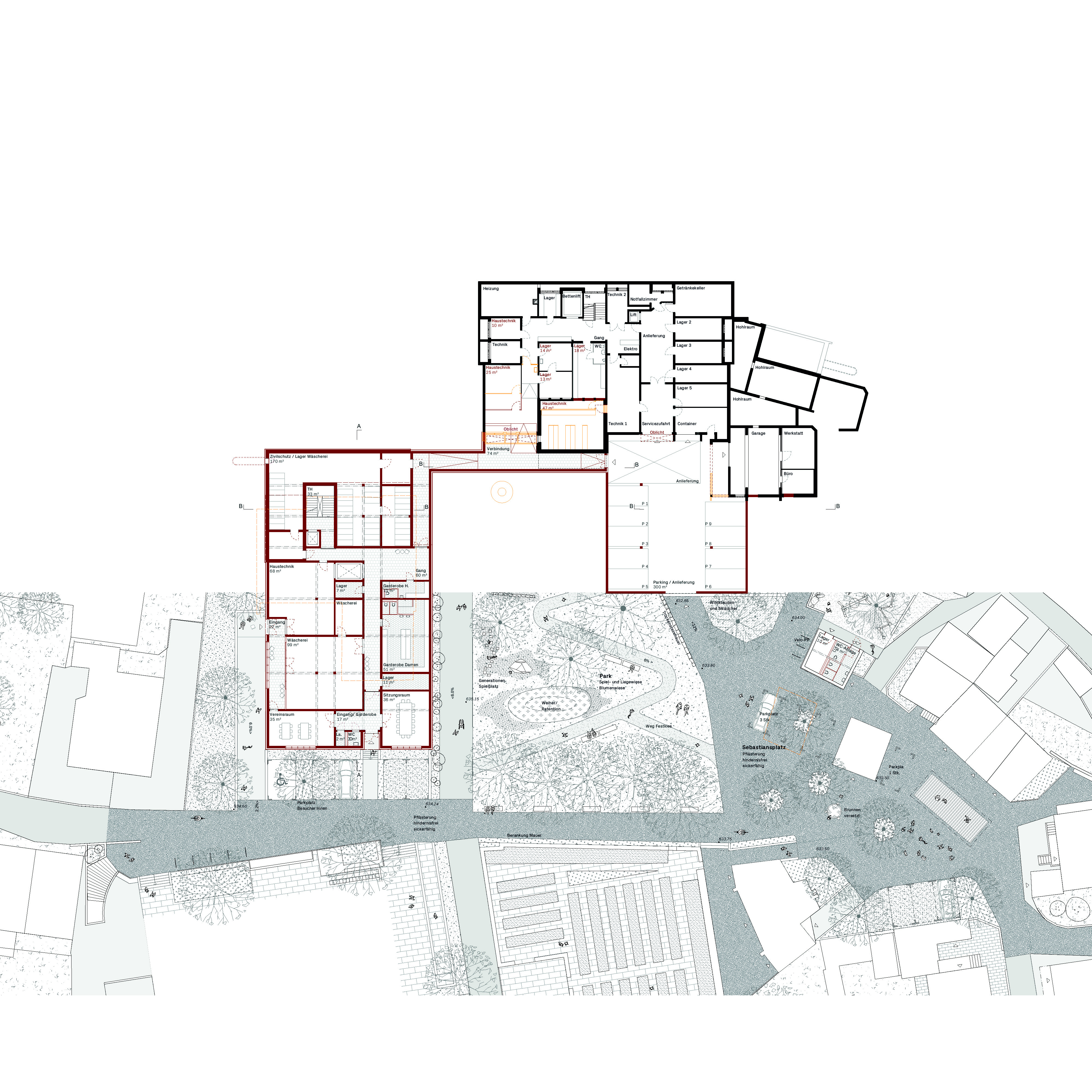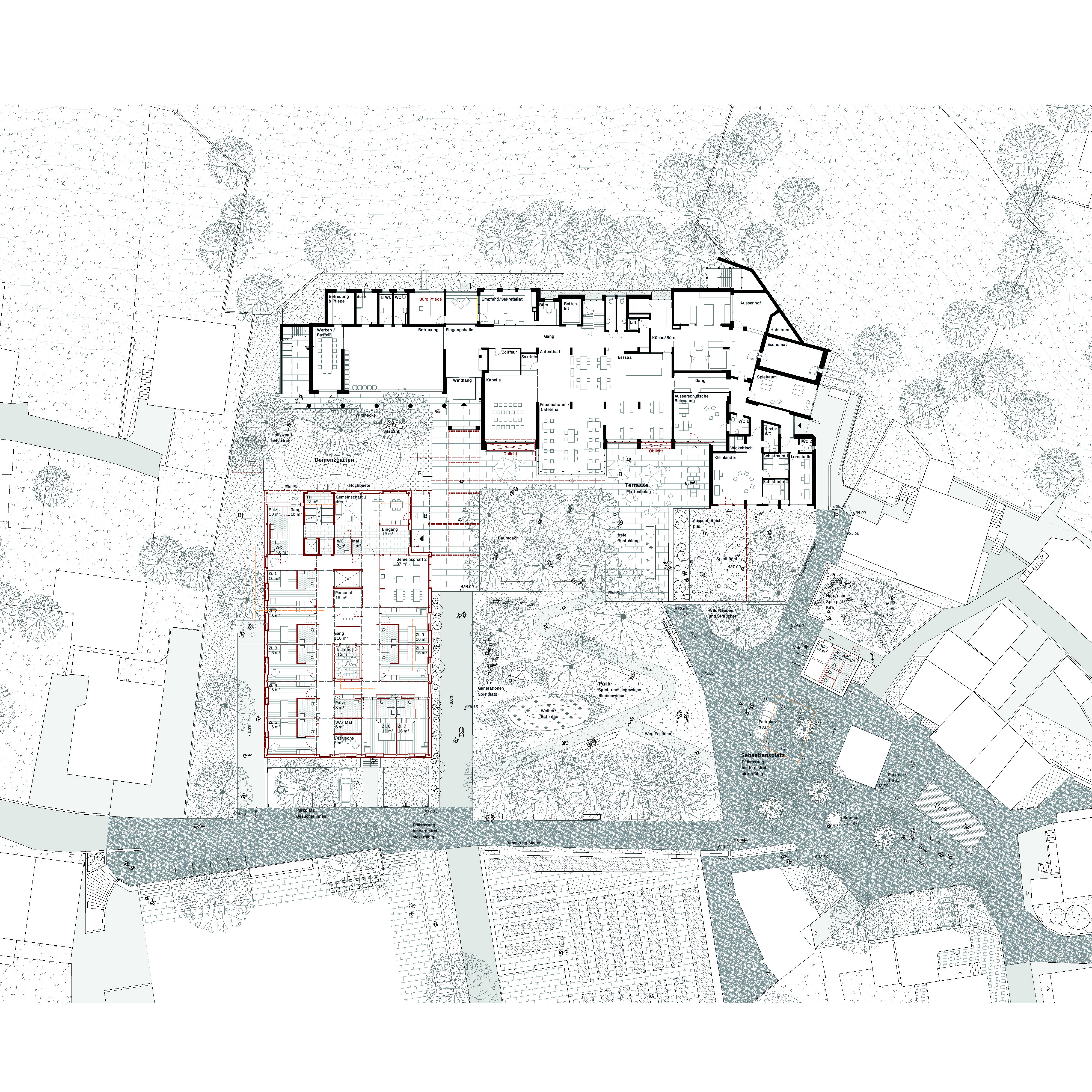 Die Setzung des Neubaus entlang der westlichen Parzellengrenze berücksichtigt den Ausblickins Tal des Bestandes sowie den Erhalt des angrenzenden Parks. Das Gebäude der Demenzabteilung ersetzt das bestehende Pfarrhaus und schafft hochwertige, offene Aussenräume. Das Sockelgeschoss, welches sich bis vor den Bestandesbau schiebt, klärt die Ankunftssituation für Bewohnerinnen, Besucher, Personal und Lieferdienste. Es fungiertsowohl räumlich als auch funktional als verbindendes Element zwischen Neu – und Altbau. Entlang der Südfassade werden die Kellerräume des Bestandes mit einem neuen Gang erschlossen und gegen Osten zu einem Parking erweitert, dadurch wird die Logistik zwischen Neu – und Altbau effizient gestaltet. Auf der Oberfläche des Sockelgeschosses befindet sich der grosszügige Mehrgenerationenplatz.