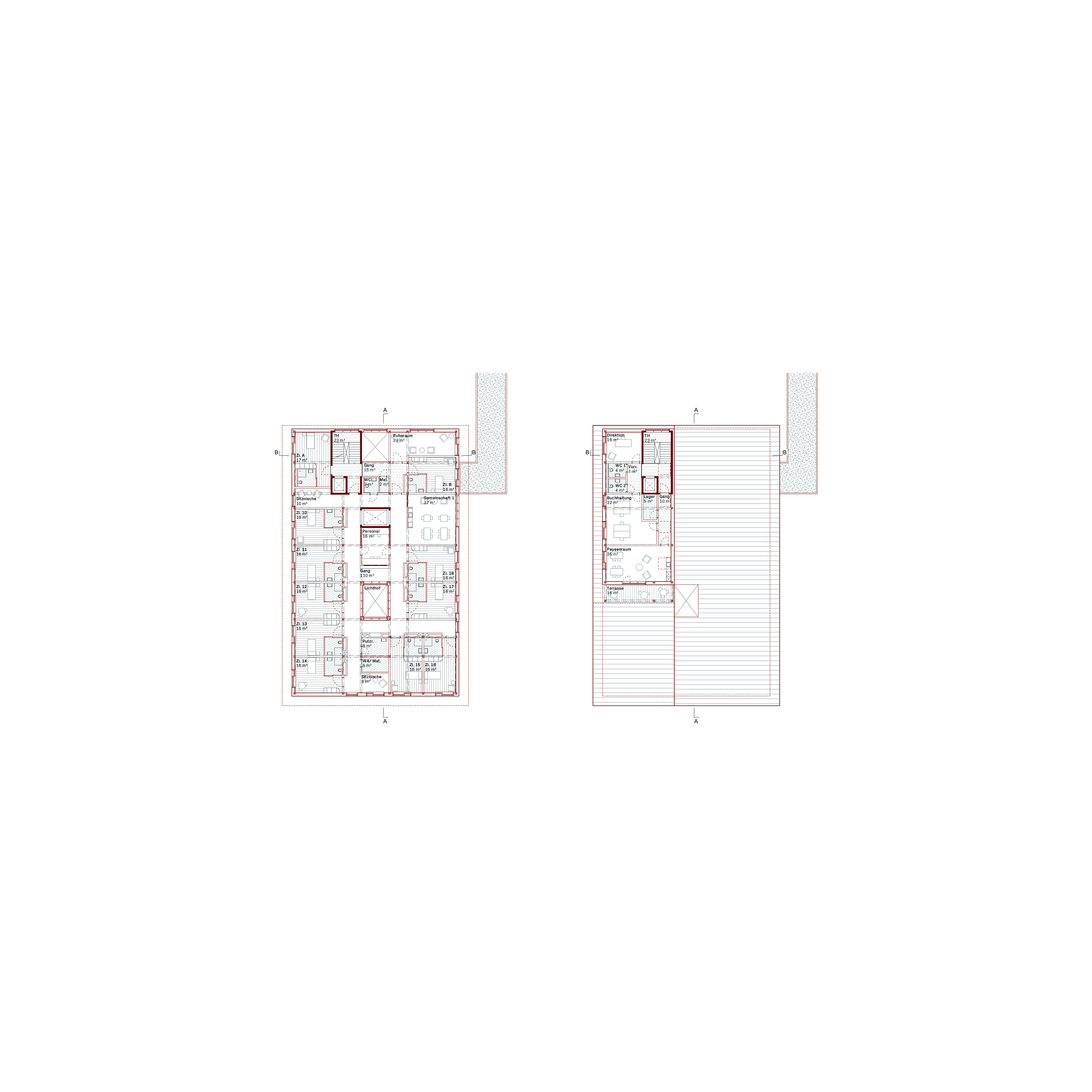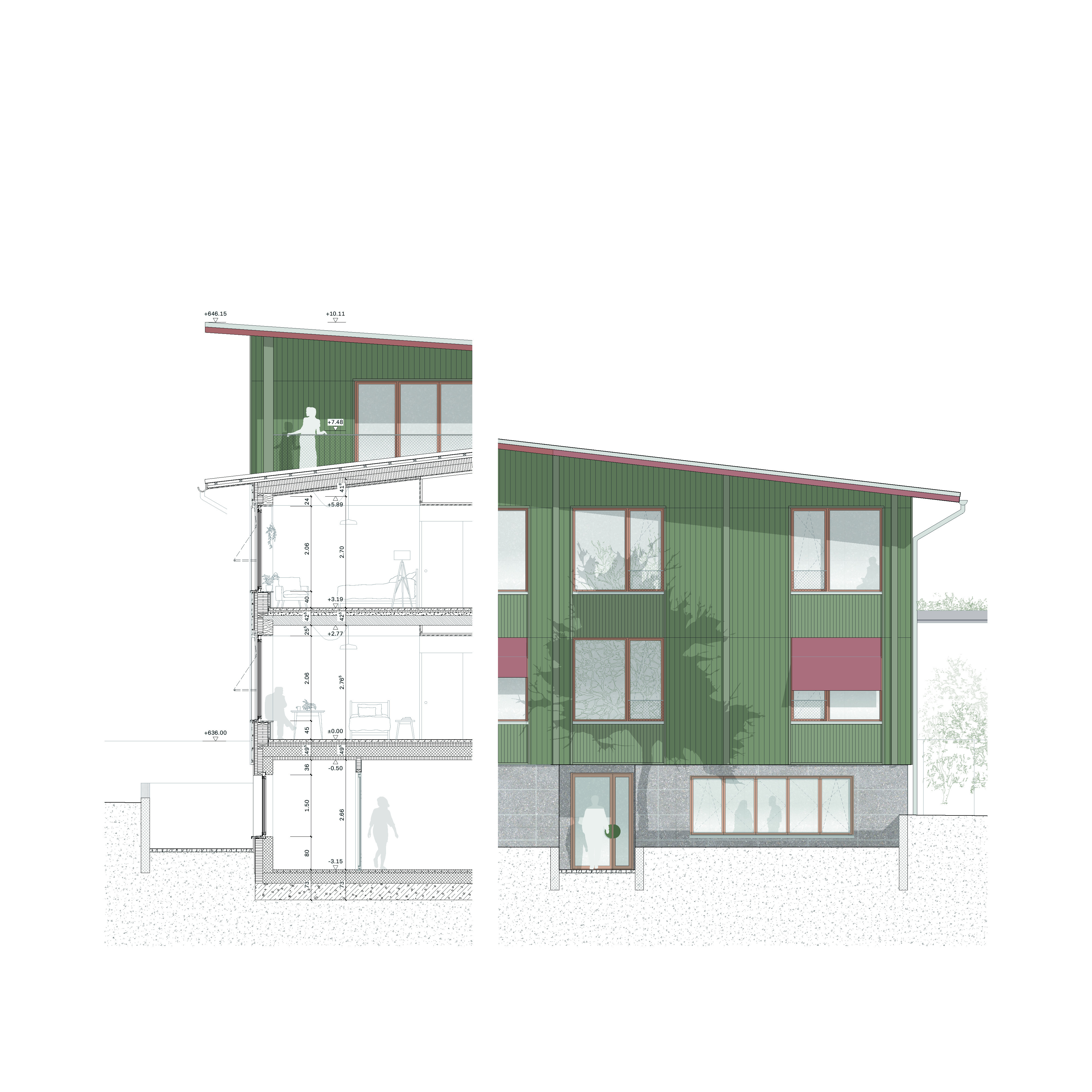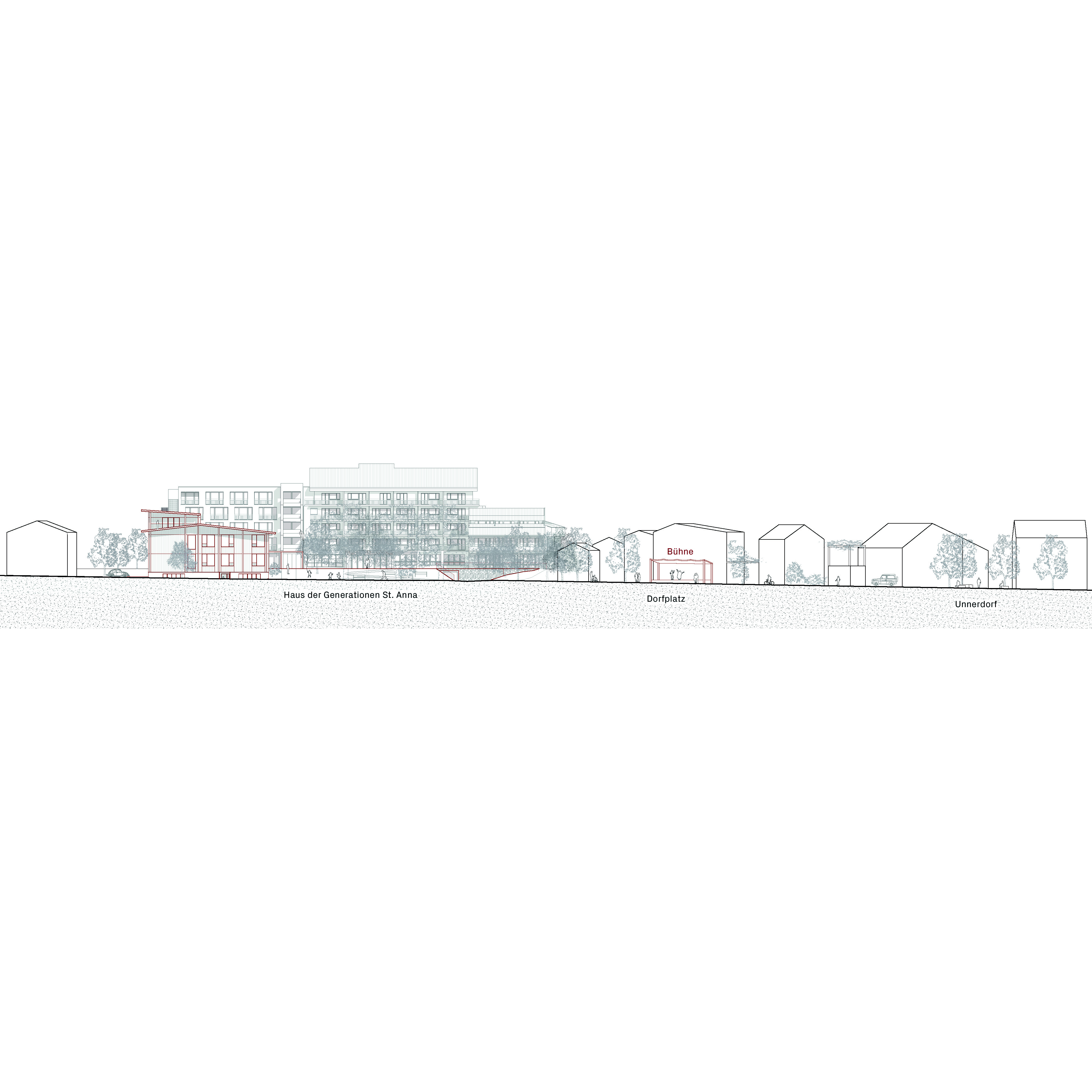 Die Setzung des Neubaus entlang der westlichen Parzellengrenze berücksichtigt den Ausblickins Tal des Bestandes sowie den Erhalt des angrenzenden Parks. Das Gebäude der Demenzabteilung ersetzt das bestehende Pfarrhaus und schafft hochwertige, offene Aussenräume. Das Sockelgeschoss, welches sich bis vor den Bestandesbau schiebt, klärt die Ankunftssituation für Bewohnerinnen, Besucher, Personal und Lieferdienste. Es fungiertsowohl räumlich als auch funktional als verbindendes Element zwischen Neu – und Altbau. Entlang der Südfassade werden die Kellerräume des Bestandes mit einem neuen Gang erschlossen und gegen Osten zu einem Parking erweitert, dadurch wird die Logistik zwischen Neu – und Altbau effizient gestaltet. Auf der Oberfläche des Sockelgeschosses befindet sich der grosszügige Mehrgenerationenplatz.