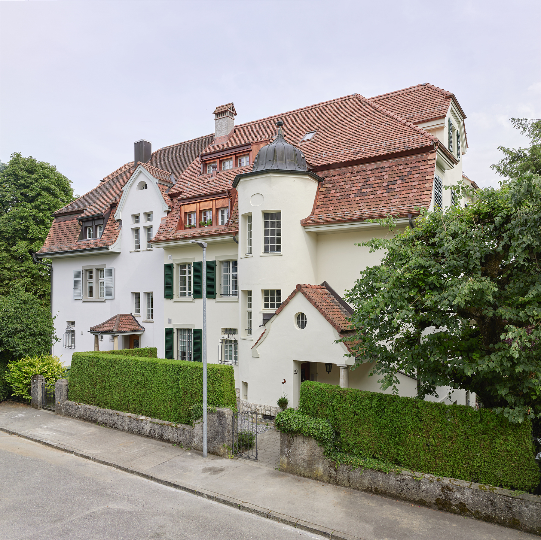 Der asymmetrische Bau an der Diesbachstrasse mit seiner repräsentativen Nordfassade weist bei der Nr. 29 als Hauptelement einen halbrunden Treppenturm mit geschweiftem Kupferhelm auf. Der Eingangsvorscherm in Form eines mächtigen Quergiebels durchdringt links den Treppenturm und stützt sich rechts auf einer dorischen Säule ab. Die Ost- und Westfassaden sind charakterisiert durch grosszügige Teilwalmquergiebel.*