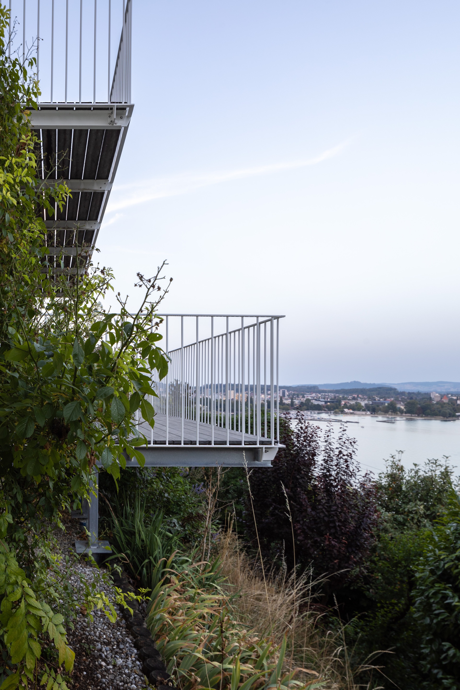 Schliesslich wurde die Position halb-auskragend über einer Stützmauer von der Baubehörde als einzige mögliche Variante akzeptiert.
