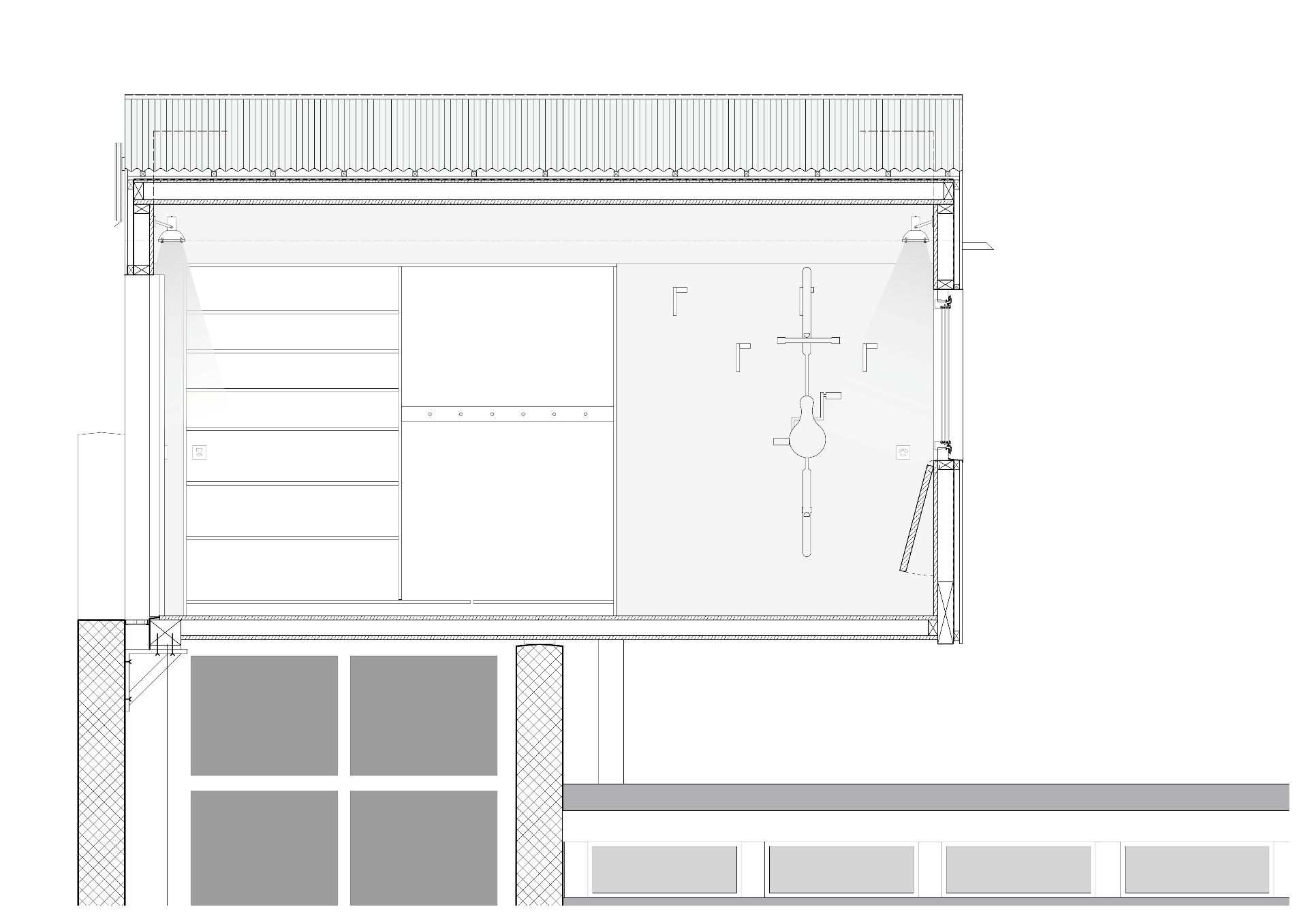 Holz wurde auch für die Innenverkleidungen und die Einbauten gewählt. Sie bestehen aus geölten Dreischichtplatten. Die Bauherrschaft legte berufsbedingt viel Wert auf Details, was für eine einfache Remise nicht selbstverständlich ist. Die asymmetrischen Doppelflügeltore aus Metall mit Holzausfachungen wurden eigens entwickelt, so dass die Fassadenbleche exakt vertikal übereinander liegen. Die Einbauschränke und der abklappbare Arbeitstisch wurden gemeinsam mit dem Holzbauer entworfen.