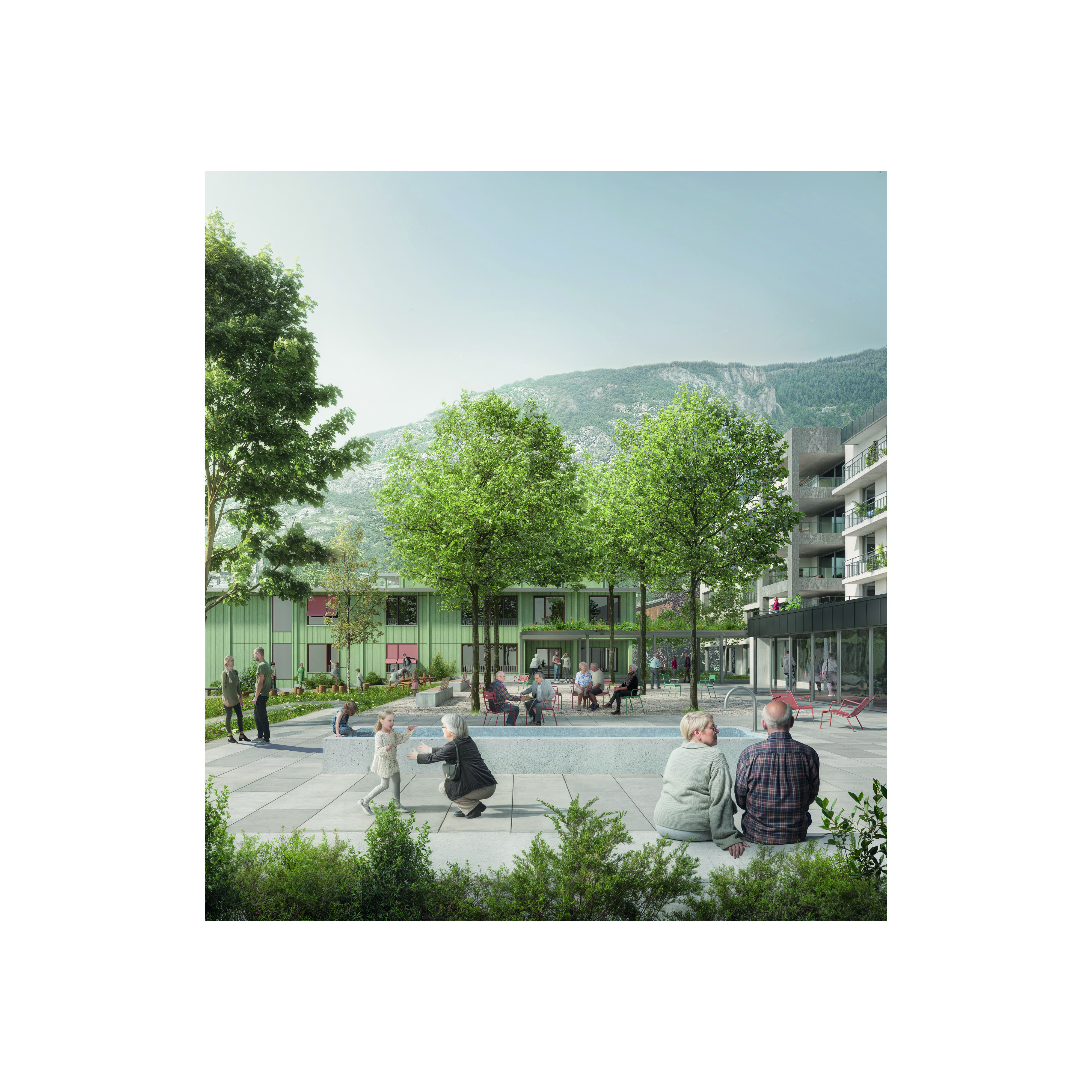 Die Neugestaltung und Aufwertung der verschiedenen Perimeter bietet die Möglichkeit, bislang getrennte Bereiche miteinander in Beziehung zu setzen und als einheitliches Ganzes zu formen. Ein durchgängig barrierefreier Natursteinbelag fasst die verschiedenen Räume zusammen und schafft so eine Verbindung der gemeinsam genutzten Freiräume. Der zentral gelegene Park sowie der Kirchplatz dienen als Begegnungs- und Erholungsräume, fördern den sozialen Austausch und ermöglichen altersübergreifende Aktivitäten. Naturnahe Gestaltungselemente wie Sitzbereiche, Spiel- und Bewegungszonen sowie eine Wasserfläche mit Retentionsfunktion verbinden Aufenthaltsqualität mit ökologischer Wirkung.