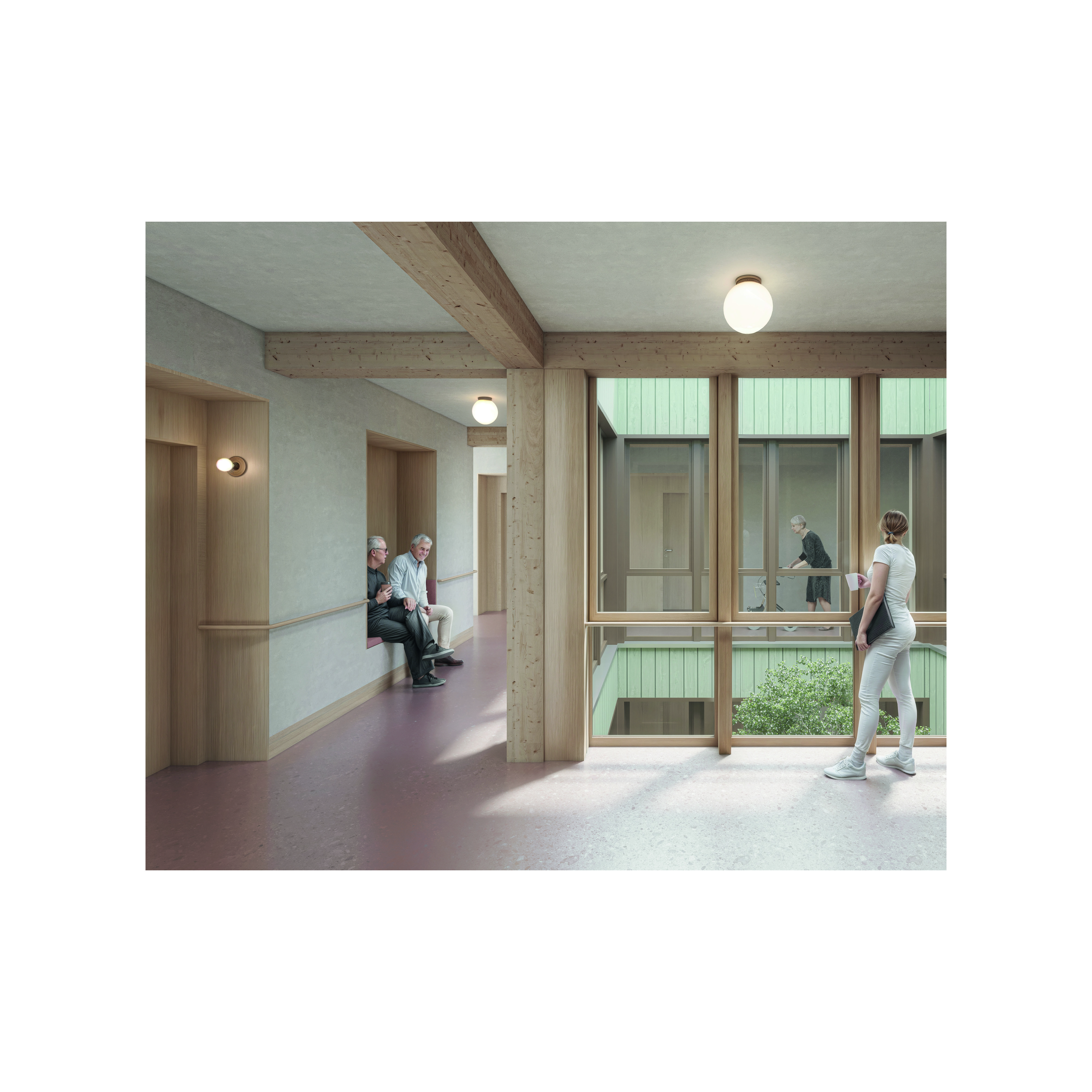 Im Sockelgeschoss verknüpft ein unterirdischer Gang mit Oberlichtern beide Gebäudeteile. Die Raumstruktur ist funktional gegliedert: Das Erdgeschoss und das erste Obergeschoss beherbergen Tages- und Nachtstruktur sowie die Demenzabteilung. Im zweiten Obergeschoss befinden sich Verwaltungsräume und ein Aufenthaltsraum für das Personal. Die Demenzabteilung ist um einen zentralen Gang organisiert, der als erweiterter Aufenthaltsbereich dient und über einen Lichthof Tageslicht erhält. Sitznischen an den Zimmerzugängen sowie an den Gangenden schaffen ruhige Rückzugsorte mit Ausblick. Der Personalraum liegt in Nähe von Treppe und Bettenlift und ermöglicht durch den Lichthof Sichtbeziehungen zu allen Zimmern und dem Gemeinschaftsbereichen.